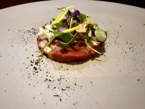 ↑馬肉と白神ウドのタルタル。