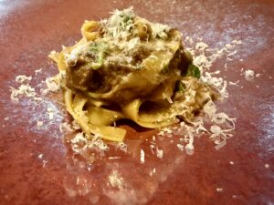 ↑手打ちフィットチーネ麺に腕肉を赤ワインで
