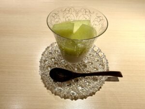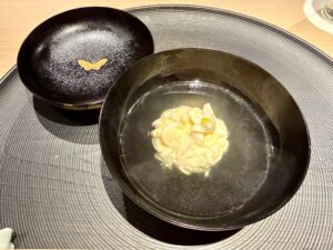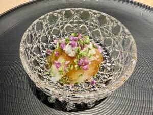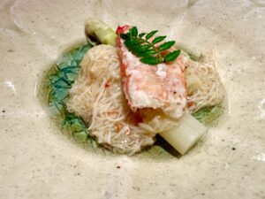↑昆布締め牡丹海老に出汁ジュレと山芋、