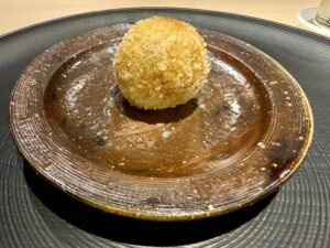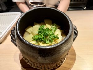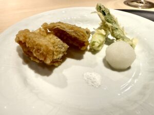 2026年4月現在、10〜11品程からなるおまかせコースのみ、27,500円。店のテーマは「旬間(しゅんかん)」。揚げたて・焼きたてなど、調理した旬の食材をもっとも美味しい瞬間に提供することを徹底しており、火入れや盛り付けのタイミングを含めた一連の流れを一つの食体験としてカウンター越しに楽しませるスタイル。スッポンの身と出汁をパン生地で包んで揚げた「すっぽんパン」、白海老の昆布締めに長芋とうるいを合わせた先付など、伝統的な日本料理の文法を踏まえながらも若い発想を随所に感じる構成になっている。日本酒は「酒ディプロマ」の資格を持つ店主大浜さんが全国から目利きした銘柄を揃えており、ペアリングの観点でも抜かりない。