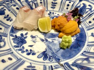 ↑一日寝かせの鯛と雲丹、海苔、山葵、塩、