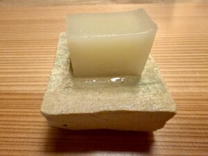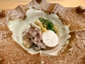 ↑サッと茹でた鼈の首肉に土佐酢ジュレを