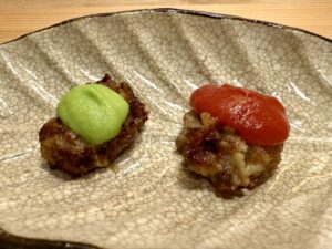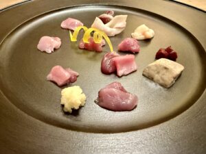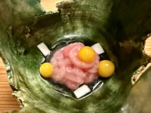 生松茸味噌漬けとイクチのレバ刺し仕立て
